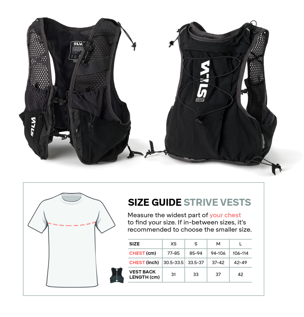 Strive 10 Vest rymmer allt du behöver under de längsta löppassen. Västen har två fickor för flaskor fram med justerbara remmar och bakre fack för vätskeblåsa med öppningar för vätskeslang på axlarna. Den har tre fickor med dragkedja, två fram varav den ena har nyckelkrok, och en bak. De stora fickorna i fram gör det enkelt att komma åt gels, bars eller handskar. Fäst pannlampan på framsidan, förvara batteriet i en elastisk ficka back och trä sladden genom kabelutgångarna på axlarna. Löparvästen har även reflexdetaljer, visselpipa för nödsituationer och remmar för löparstavar.